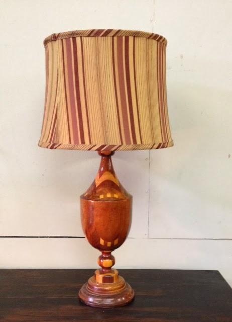 1. Marquetry lamp, featuring varying types of inlaid wood. Booth #133, $225.